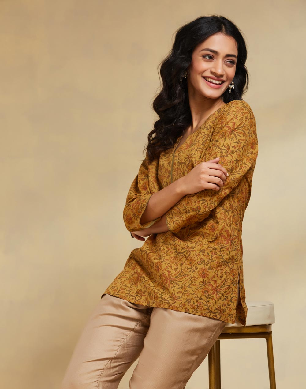 Brown Cotton Silk Hand Block Printed Short Kurta