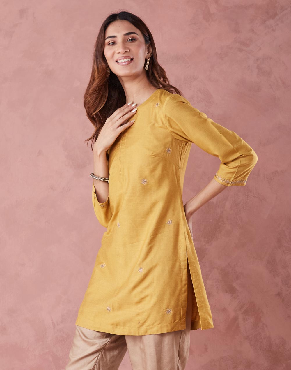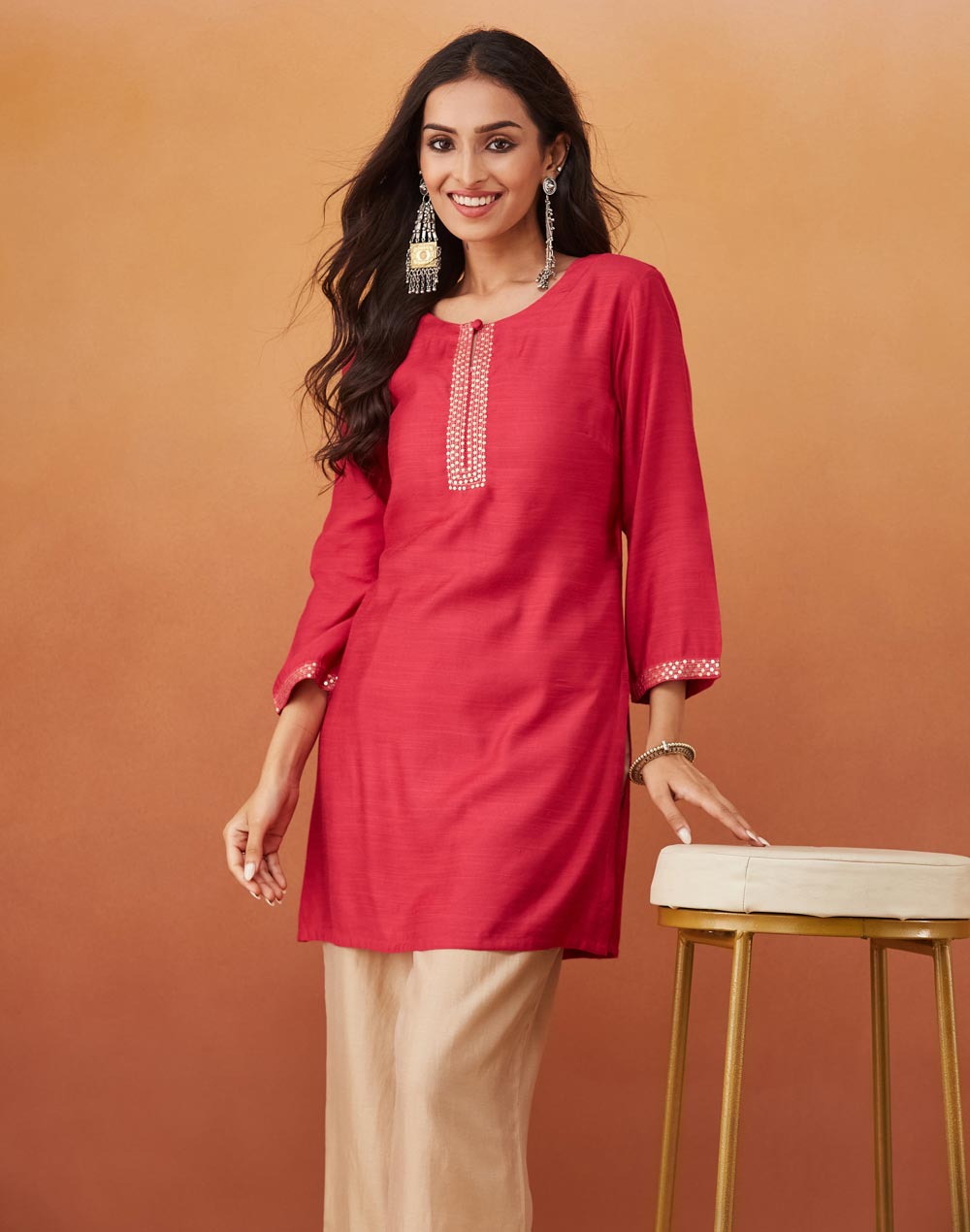 Pink Viscose Silk Slim Fit Embroidered Short Kurta