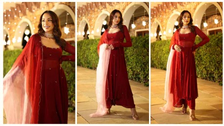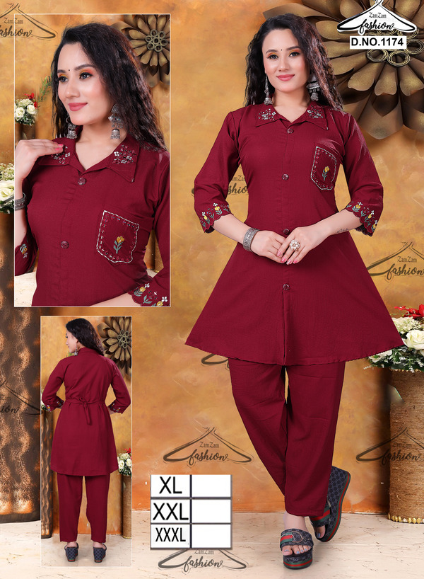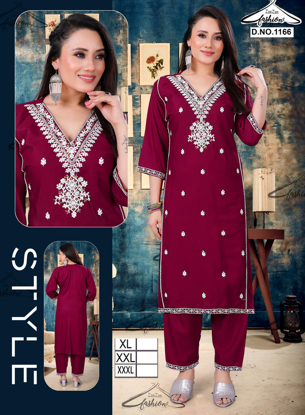 A plain georgette kurti design crafted from maroon georgette fabric with detailed embroidery boasts an elegant and versatile appearance. The round neckline offers a classic and comfortable style, making it suitable for various occasions. The kurti features churidar sleeves, which are snugly fitted around the wrists, adding a touch of traditional charm. Its umbrella pattern gives it a graceful and flared silhouette, perfect for a flowy and feminine look. This MAROON BLUSH EMBROIDERED GEORGETTE SUIT SET is a great choice for those seeking a blend of sophistication and comfort, making it ideal for both formal events and casual gatherings. It can be accessorized to suit various fashion preferences.